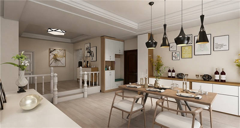 典型的四人餐厅格局,搭配木色的餐桌椅,让整个餐厅显得更加自然,美观,一整面的餐边柜,也让餐厅变得更实用。