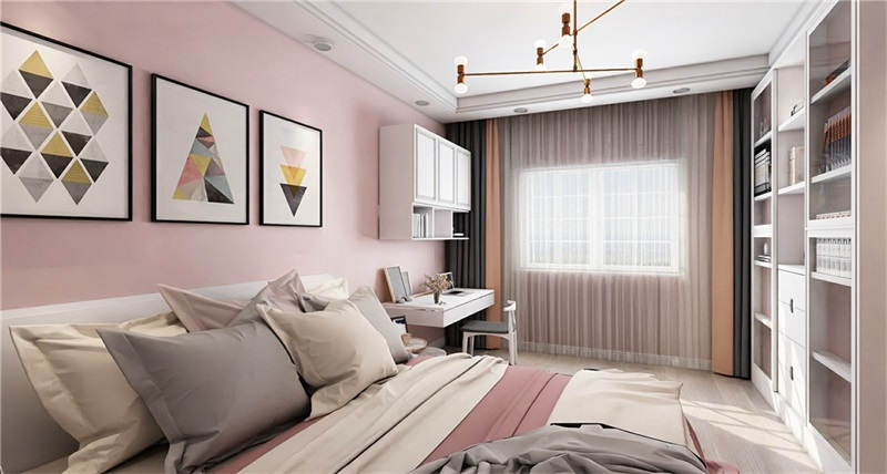 次卧室相当于一个儿童房,但却显得非常的具有时尚感,全屋以粉色为主色调,给人一种很梦幻的感觉,吊柜+悬挂桌,形成了一处安静的学习区域,通顶的衣柜,也给次卧增添了很多的收纳空间,为孩子创造一个既舒适又美观的私密环境。