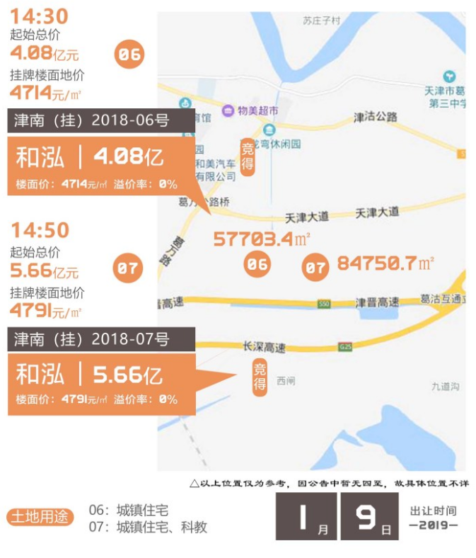 1月9日下午的开年首拍,津南(挂)2018-06号和津南(挂)2018-07号被天津和泓东泰置业以总价9.74亿元总揽,其中06号地块总价4.08亿,成交楼面价4714元/㎡;07号地块总价5.66亿,成交楼面价4791元/㎡。