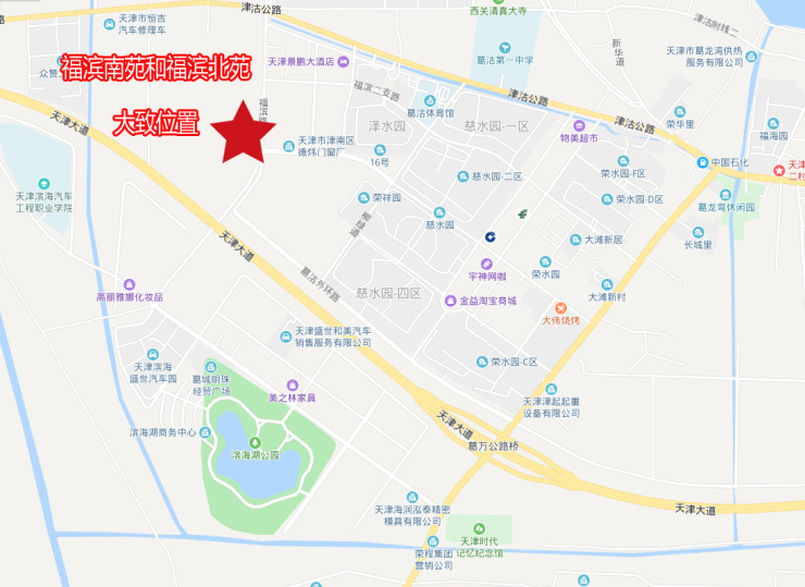 根据规划图显示,该项目备案名为福滨南苑和福滨北苑,分别对应两宗地块,均位于葛沽镇,以福滨路为界分南北苑,福滨南苑位于新房道和福滨路交口西北方向,福滨北苑位于海沽道和福滨道交口西南方向。