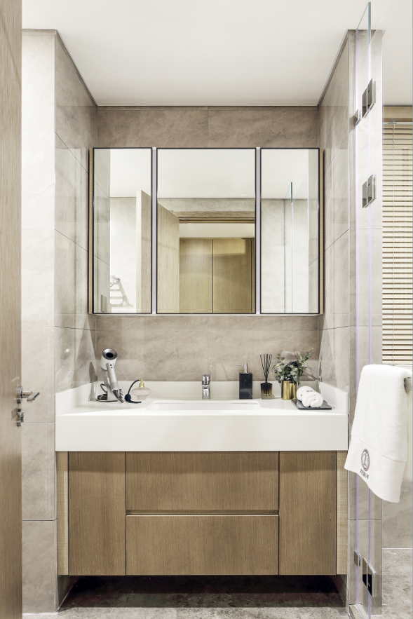 天津宾西路5号项目,在卫浴空间,配置约171升卫浴柜系统,摩恩五金置物架,精细化便捷收纳,汉斯格雅龙头花洒,唯宝洗脸盆,TOTO洁具,尽享日常舒爽感受,体验从容与自在。同时,卧室衣帽间约3564升衣柜,让起居更衣整理更加井井有条。