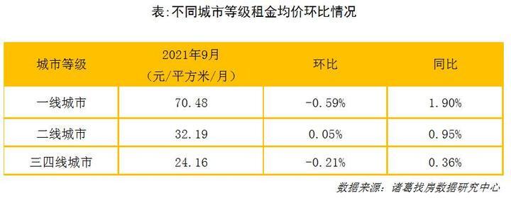 诸葛找房数据研究中心介绍,2021年9月,一线、三四线城市租金均价环比下跌,且一线城市跌幅连续两月居首,二线城市租金均价止落回升。其中,一线城市平均租金为70.48元/平方米/月,环比下跌0.59%,同比上涨1.90%;二线城市平均租金为32.19元/平方米/月,环比上涨0.05%,同比上涨0.95%;三四线城市平均租金为24.16元/平方米/月,环比下跌0.21%,同比上涨0.36%。