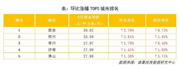 从环比上涨城市来看,本月租金环比上涨的TOP5城市为西安、郑州、常州、济南、佛山,环比分别上涨2.70%、2.61%、1.78%、1.41%、1.30%。
