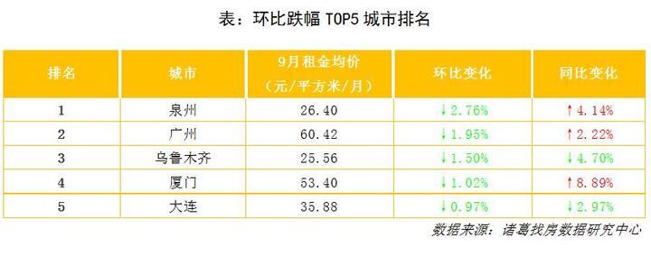 从环比跌幅TOP5城市来看,9月份租金跌幅前5城市分别是泉州、广州、乌鲁木齐、厦门、大连,环比跌幅为2.76%、1.95%、1.50%、1.02%、0.97%。