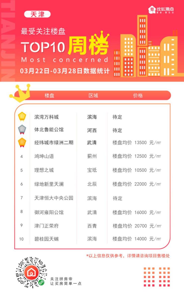 上周(3月22日-3月29日)热盘榜单出炉。其中,市区上榜一个项目,环城上榜两个项目,远郊此次扎堆挤进前十,共上榜四个项目,滨海新区仍持续受到众多关注,这次上榜三个项目。