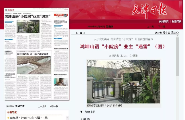 鸿坤山语在早在19年的时候就针对其“小院房”这一卖点进行大肆宣传,大量业主奔着“小院”花高价买房,实际交付时才发现和当初承诺的大相径庭。其实早在2010年国家已经明令禁止卖“小院”,这一事件在当年被天津日报曝光,被区市场监管局认定为虚假宣传。