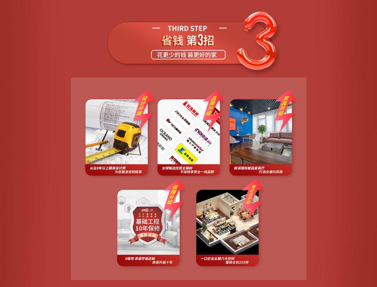 全包圆走心提供设计、品牌、家具、保障、性价比“五重升级”,可谓每重都直击消费者“痛点”。设计升级由从业8年以上精英设计师操刀定制消费者爱居,设计不满意?改!直到消费者满意为止;品牌升级保障业主不加钱享受全球甄选优质一线主辅材品牌,安心又放心;家具升级则新添国际奢品家具厅,打造全屋不一样的风格;保障升级承诺0增项+环保达标+质保十年,完善解除后顾之忧;性价比升级可享一口价含全屋六大空间,整装全包233项,十足给力。