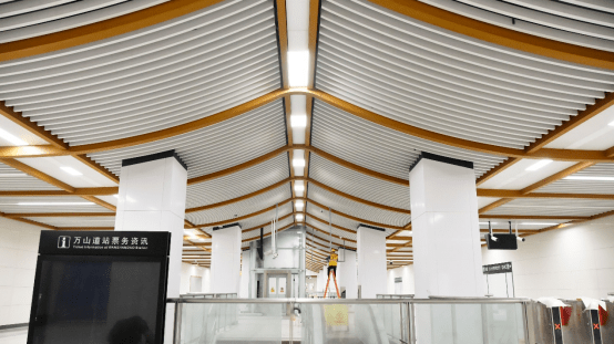 天津地铁10号线以黄绿色为主题色,万山道站,车站以装修整体以灰、白、木为主色调,站厅层米白色的铝板和墙面瓷砖、仿白麻的地面瓷砖让空间整体非常清新简约,力求让乘客在这个空间内感受愉悦舒适的出行体验。作为16个标准装修车站之一,万山道站最能体现出10号线总体的设计理念和设计风格。