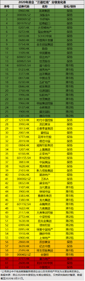 据贝壳研究院发布统计表明:截至3月31日,超62家房企发布年报,其中近五成房企“三道红线”实现降档,3家房企保持红档,12家房企保持绿档。被统计的房企中,未出现“升档”企业。