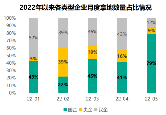 58安居客房产研究院对北京、上海、广州、苏州、南京、郑州等18个城市的监测显示,2022年1月份,国企(含央企)和民企在土地市场上各占半壁江山,此后国企的占比迅速提升,2月份为60%,5月份已接近90%。数据整理自58安居客房产研究院