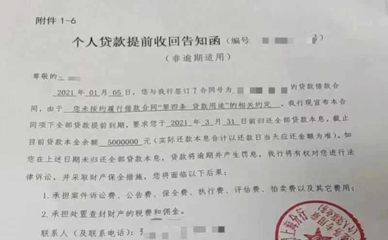 三月初,网上传出一则某银行清理违规经营贷的通知。通知称,这位客户在1月份贷的500万经营贷,违反了贷款用途的规定,要求他在3月底之前提前还贷,否则将被起诉和查封资产。