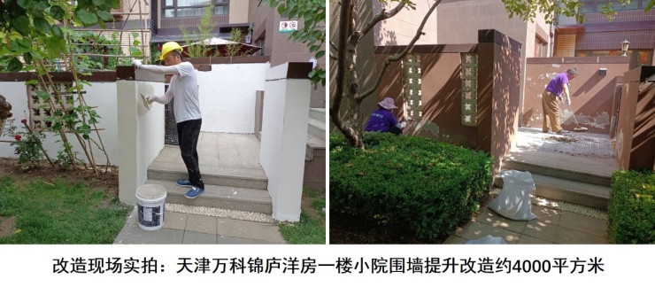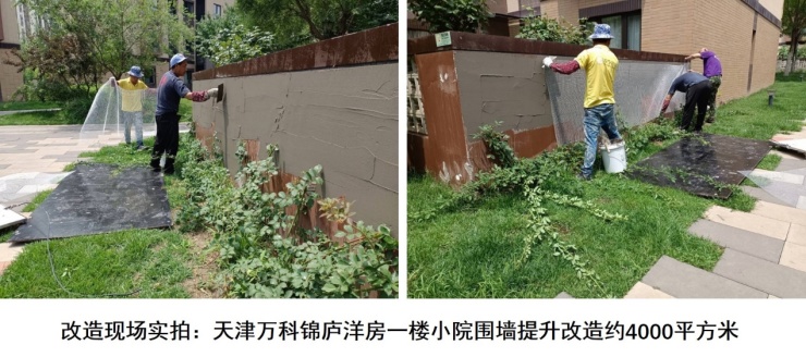 在万科锦庐,工人们正在热火朝天改造着洋房一楼的小院围墙,施工面积累计约4000平方米,业主张春英指着身旁正在抹灰的工人说:“现在小区进行了重新改造,居民们很满意,这个小区绿化也好、环境也好,我们生活很舒适,住得很愉悦。”