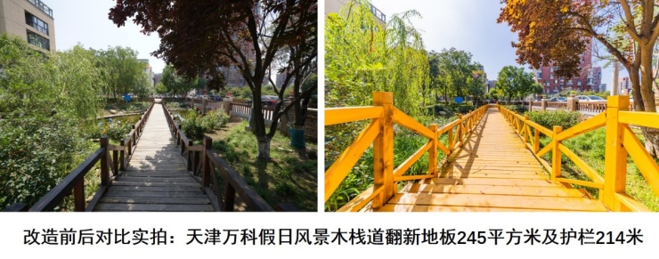 先来看假日风景的金秋改造收获,在这个十六年的老小区,万科物业夏送冷饮、冬送暖茶,每逢佳节物业组织业主一起庆祝,每年朴里节为期一个月的社区文化节增进了业主之间的情感交流,邻里关系和睦。不过,时光荏苒,岁月留痕,小区设备设施也不可避免的逐年老化,物业在日常工作中实时对小区环境进行改善与提升。去年由万科地产投入资金改造了园区路面、休闲亭和廊架地面,今年对小区木栈道和部分楼座外檐进行翻新改造。