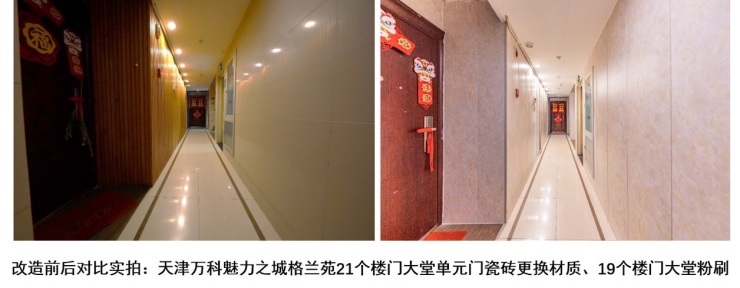 魅力之城是交付十一年的老小区,去年由万科投入资金主要修缮了地下车库,对围墙护栏重新修缮刷漆,还对园区局部进行了绿化改造。今年主要是粉刷部分楼座山墙,将楼门大堂单元门年久脱落的瓷砖更换成UV材质,对部分楼门大堂重新粉刷,还改造翻新了出现破损的烟道。