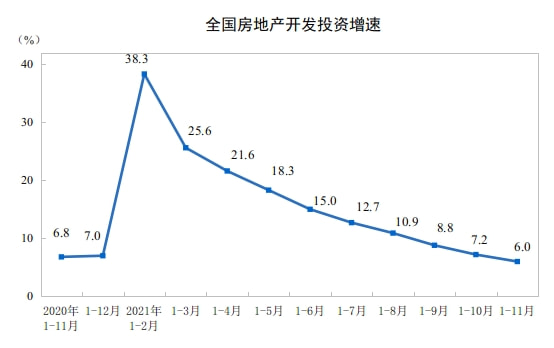 12月15日,国家统计局公布2021年1-11月全国房地产开发投资和销售情况。前11个月,全国房地产开发投资13.73万亿元,同比增长6.0%,数据增速持续收窄,由“热”转“温”。与此同时,受融资环境影响,房屋新开工面积、房企土地购置面积分别同比下降9.1%、11.2%。
