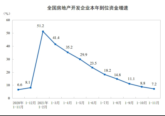 国家统计局数据显示,1-11月份,房地产开发企业到位资金18.34万亿元,同比增长7.2%;比2019年1-11月份增长14.2%,两年平均增长6.9%。其中,国内贷款2.16万亿元,下降10.8%;利用外资90亿元,下降41.7%;自筹资金5.94万亿元,增长4.8%;定金及预收款6.72万亿元,增长17.0%;个人按揭贷款2.96万亿元,增长9.8%。