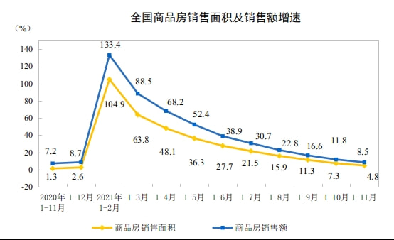 据国家统计局数据显示,整体来看,1-11月份,全国商品房销售面积15.81亿平方米,同比增长4.8%;商品房销售额16.17万亿元,同比增长8.5%。截至11月末,全国商品房待售面积5.02亿平方米,比10月末减少38万平方米。