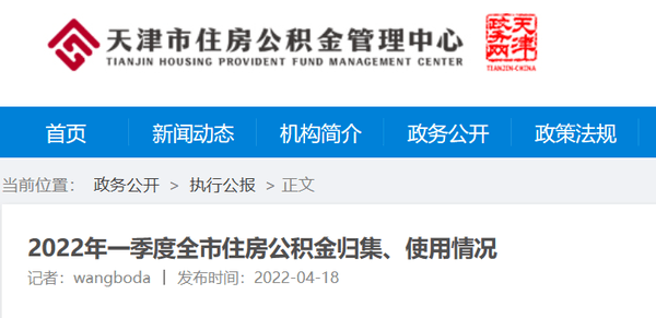 4月18日天津市住房和公积金网站发布《2022年一季度全市住房公积金归集、使用情况》。