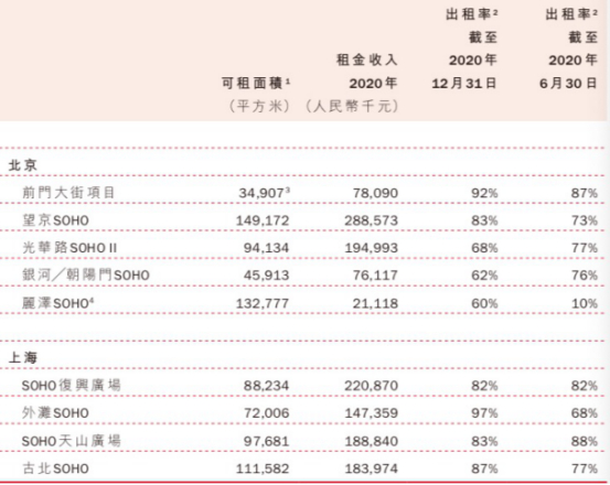 于2019年,北京前门大街项目、望京SOHO、光华路SOHO II、银河/朝阳门SOHO出租率分别为95%、86%、87%、94%,而上海的SOHO复兴广场、外滩SOHO、SOHO天山广场、古北SOHO物业出租率分别为95%、78%、97%、67%。