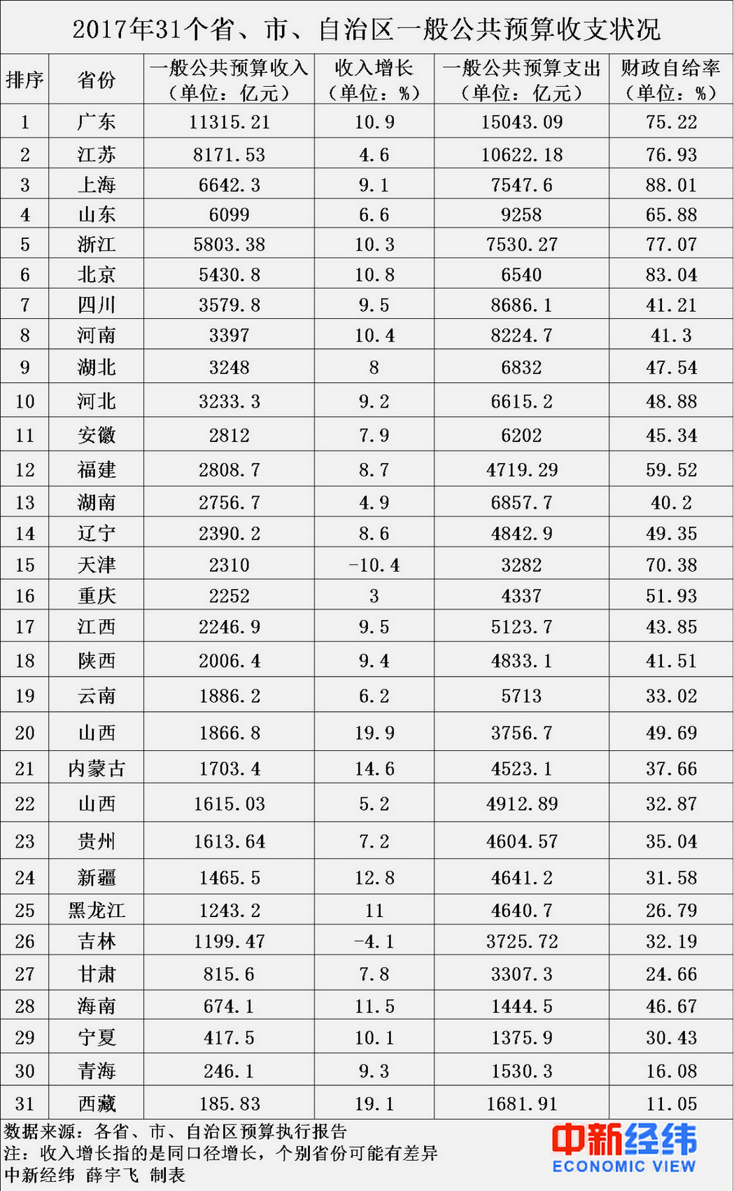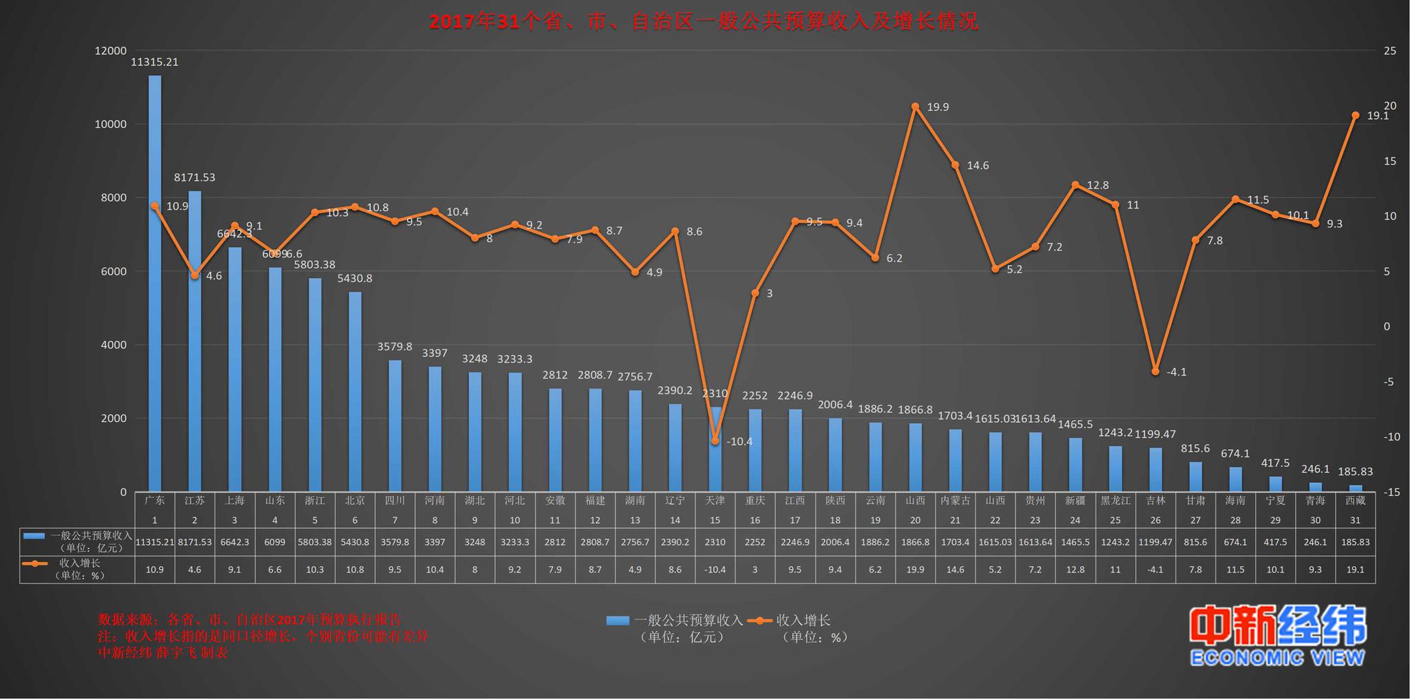 31省份2017年财力比拼出炉 天津收入出现负增长