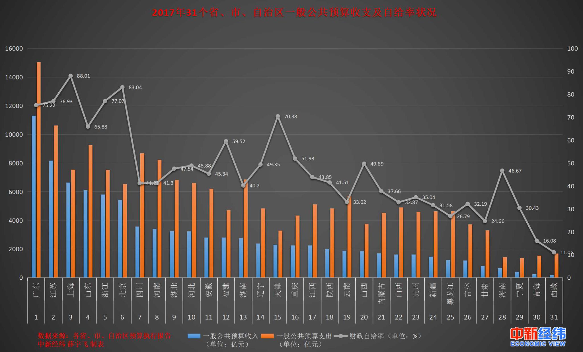 财政收入,是一个行政区域硬实力的体现,决定着这个区域在城市建设、民生支出等方面的投入,而一般公共预算收入则是财政收入重要的组成部分。根据各地2017年预算执行报告统计,广东、江苏、上海三地的一般公共预算收入位居前三甲,广东省更是高达1.31多万亿元;增速上,山西、西藏、内蒙古增长较快,吉林、天津出现负增长;财政自给率方面,东高西低的态势十分明显。