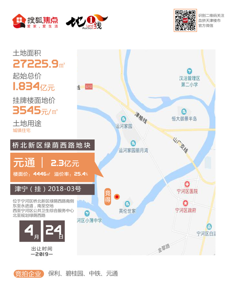 恰逢月末,又值五一小长假前的最后一周,天津土地市场再度迎来拍地高潮!4月24日下午,天津宁河与武清区3宗宅地相继出让,其中津宁(挂)2018-03号宗地由元通以2.3亿元摘得,楼面价4446元/㎡,溢价率25.4%;津武(挂)2019-025号宗地由金科以12.35亿元摘得,楼面价8533元/㎡,溢价率31.2%;津武(挂)2019-026号宗地由新城以15.2亿元摘得,楼面价7954元/㎡,溢价率25.8%。