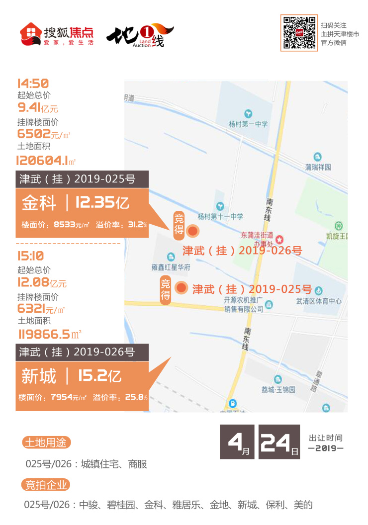 经过短暂的休整,武清区2宗地块也迎来摘牌,共吸引了中骏、碧桂园、金科、雅居乐、金地、新城、保利、美的共计8家房企到场。最终,津武(挂)2019-025号宗地经过60轮激烈的竞拍,由金科以12.35亿元拿下,津武(挂)2019-026号宗地由新城以15.2亿元拿下。