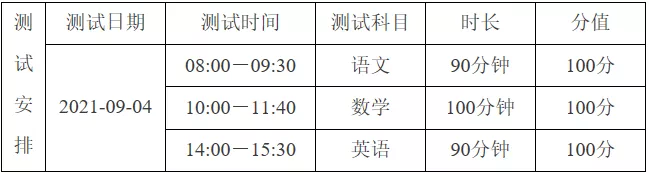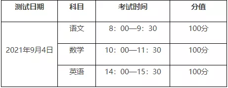 4.统一测试。2021年9月4日(周六),区教育局对通过资格审核的学生进行统一测试。测试科目语文、数学、英语。