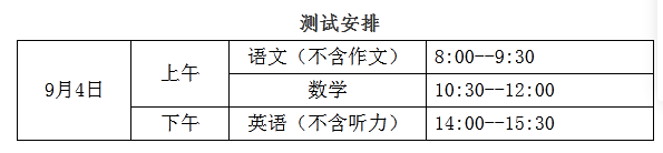 9月4日上午 8:30-10:00语文;10:20-11:50 数学;下午14:00-15:30英语(不含听力)