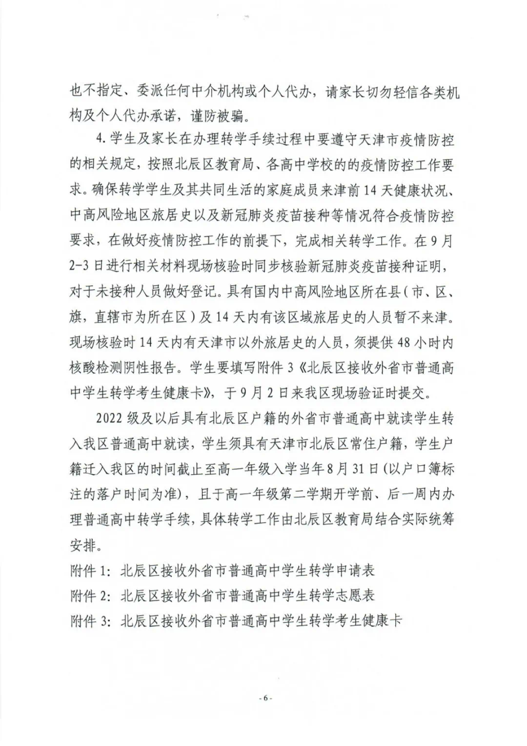 (五)加强疫情防控,做好应急预案。要严格落实秋季开学疫情防控有关要求,做好疫情防控应急预案,确保工作安全、平稳、有序。要精准掌握转学学生及其共同生活居住的家庭成员来津前14天健康状况、中高风险地区旅居史等情况,在进行相关材料现场核验时同步核验新冠肺炎疫苗接种证明,对于未接种人员做好登记。具有国内中高风险地区所在县(市、区、旗,直辖市为所在区)及14天内有该区域旅居史的人员暂不来津;现场核验时14天内有天津市以外旅居史的人员,须提供48小时内核酸检测阴性报告。
