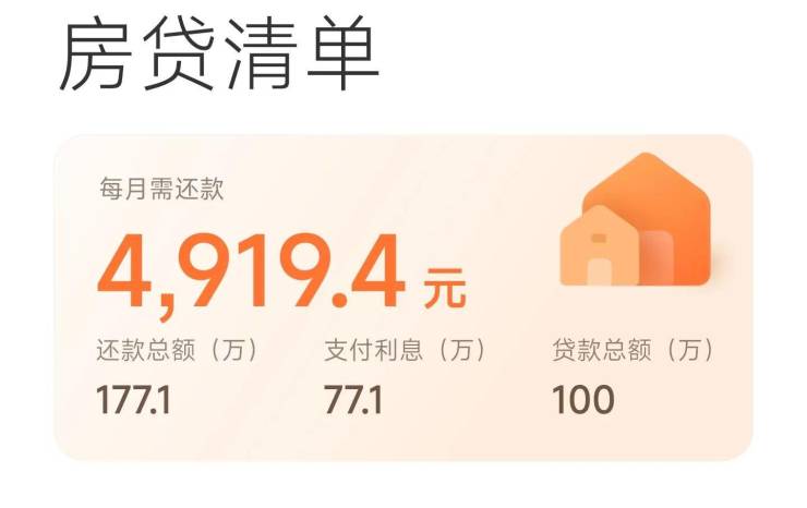 如果房贷利率只有4.25%的情况下,每月只需要还款4919.4元,每月少支付利息1400元左右,支付利息总额是77.1万元。30年,会少支付利息50万元。