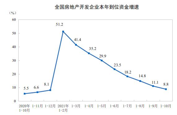 据国家统计局数据显示,1-10月,房地产开发企业到位资金16.66万亿元,同比增长8.8%。其中,国内贷款2.01万亿元,同比下降10.0%;利用外资72亿元,同比下降35.4%;自筹资金5.26万亿元,同比增长5.1%;定金及预收款6.2万亿元,同比增长21.0%;个人按揭贷款2.67万亿元,同比增长9.7%。