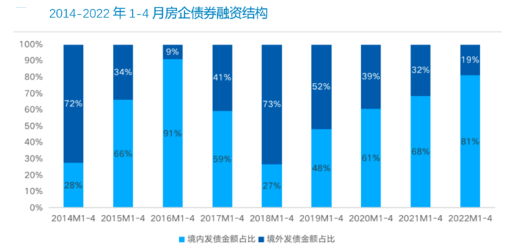 一个值得注意的现象是,境内、外债券规模占比差距正在逐步拉大。贝壳研究院数据显示,1-4月境外债券规模约442亿元,同比减少65%,其规模占比进一步下滑至19%,较2021年同期下降13个百分点;境内融资规模约1908亿元,同比减少30%,其规模占比提升至81%。