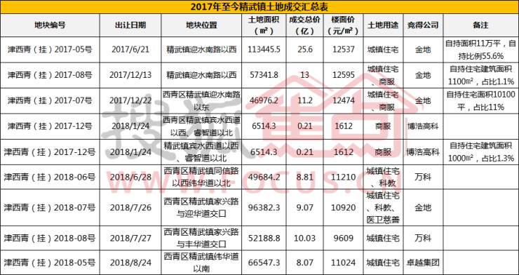 介绍规划之前,笔者带大家回顾津西青(挂)2018-07号宗地出让情况。2018年6月28日,西青一口气挂出5宗地块,其中07号宗地以9.07亿元起始总价挂出,7月26日,该地块迎来摘牌,金地以底价成交,折合楼面价10920元/平米。