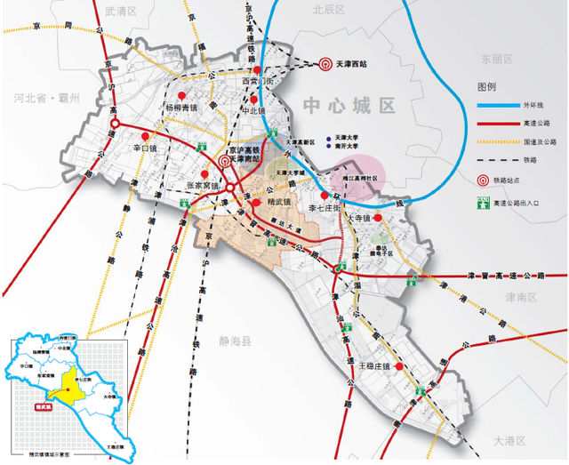 精武镇地处天津纵向西部发展带与横向南部产业带交叉处,并且位于西青区中部的新城和西青经济技术开发区两大发展组团的中心位置,是西青乃至全市最靠近中心城区的街镇,地理位置优势显著。