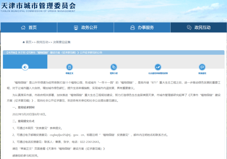 为加快推进以外环绿道为纽带串联打造11个植物公园规划建设,形成城市“一环十一园”的“植物园链”,近日,天津市城市管理委员会制定了《天津市“植物园链”建设方案》,现向社会公开征集意见。