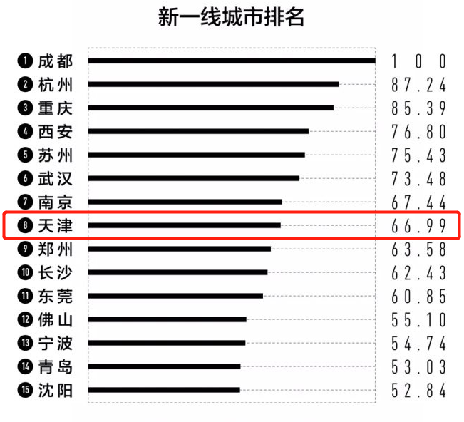 近日,排名前列财经·新一线城市研究所发布了《2021城市商业魅力排行榜》,15个新一线城市公布,天津名列第8。