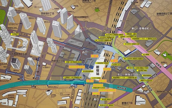 新宿站位于东京都新宿区、涩谷区,距离东京直线距离约16公里, 是世界上最繁忙的交通枢纽之一,日吞吐量达到364万人次,汇集了日本旅客铁道(JR)、地铁等共9条轨道,设有178个出口,是日本重要的枢纽站,也是获吉尼斯世界纪录认证为世界上使用人次最多的车站。