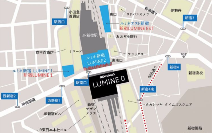 车站四周与地上的购物中心及百货同样接驳良好,为车站东西两侧商业体设有与车站相连的地下通道。总体来说,新宿车站站台在地下二层,地下一层商业是连结周边商业的主干平台,分散在四周的商业体是其发散出的枝干。
