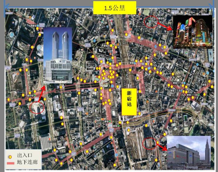 新宿站将交通枢纽与周边商业高效联通,并有效提高了周边土地的利用效益,接驳伊势丹百货、小田急百货等15座实体商业,商业用地达48公顷,占新宿站及周围开发总用地面积的约1/3。