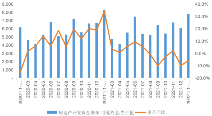 图:2020年以来房地产到位资金(自筹资金)当月值及同比增速(单位:亿元,%)