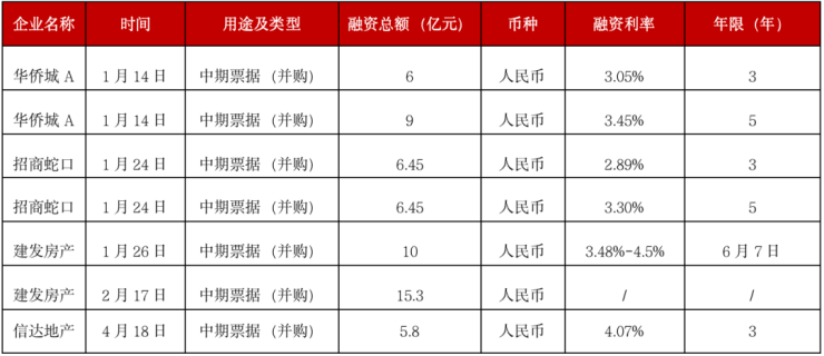 根据CRIC不完全统计,1月以来部分企业已发行并购债券或获批并购相关银行融资额度合计约1719亿元,其中,已发行的并购中期票据共7笔,共计59亿元。成功发行并购中期票据的企业多以央企国企为主。