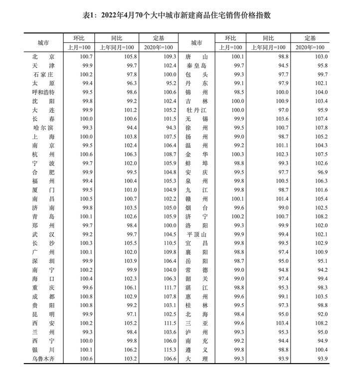 5月18日,国家统计局发布2022年4月份70个大中城市商品住宅销售价格变动情况。