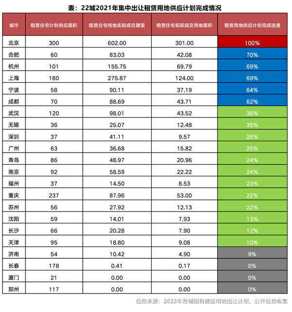 从2021年各城涉租赁用地的供应完成计划来看,利用新建租赁用地建设租赁住房的完成进度中,仅有6城的完成进度达到60%以上,22城中有16城的实际完成进度不超过供应计划的40%。