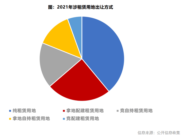 2021年各城主要以五种方式供应涉租赁用地,租赁住房的主要供应来源于纯租赁用地面积,占比达39%;其次为拿地配建租赁用地,占比为24%;竞自持租赁用地占17%。