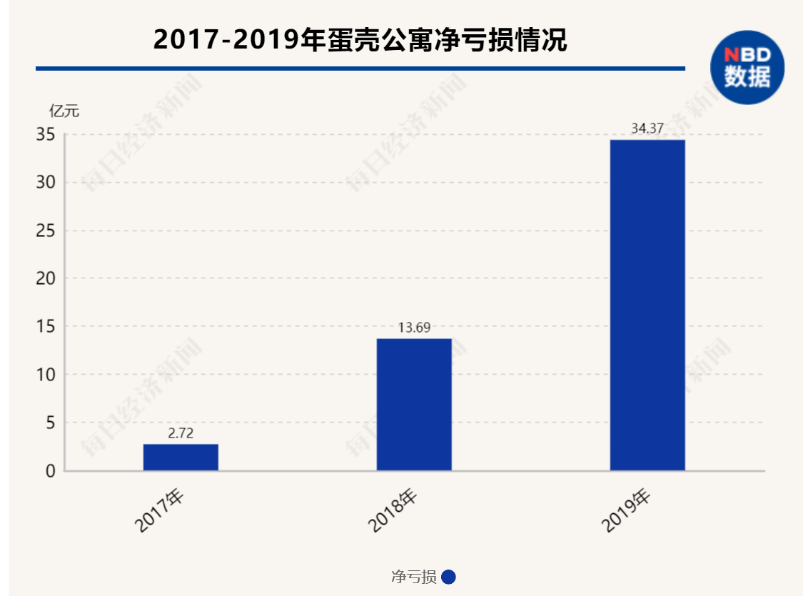 不过扩张的代价是逐年递增的亏损。从财务数据看,2017年、2018年和2019年,蛋壳公寓的净亏损额分别是2.72亿元、13.69亿元和34.37亿元;有息负债从2017年9.37亿元增至2019年的52.23亿元,年复合增长率高达229%。