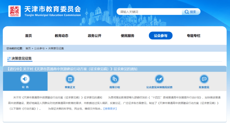 加快推进普通高中资源建设,近日,天津市教委发布关于对《天津市普通高中资源建设行动方案(征求意见稿)》征求意见的通知,方案明确提出——