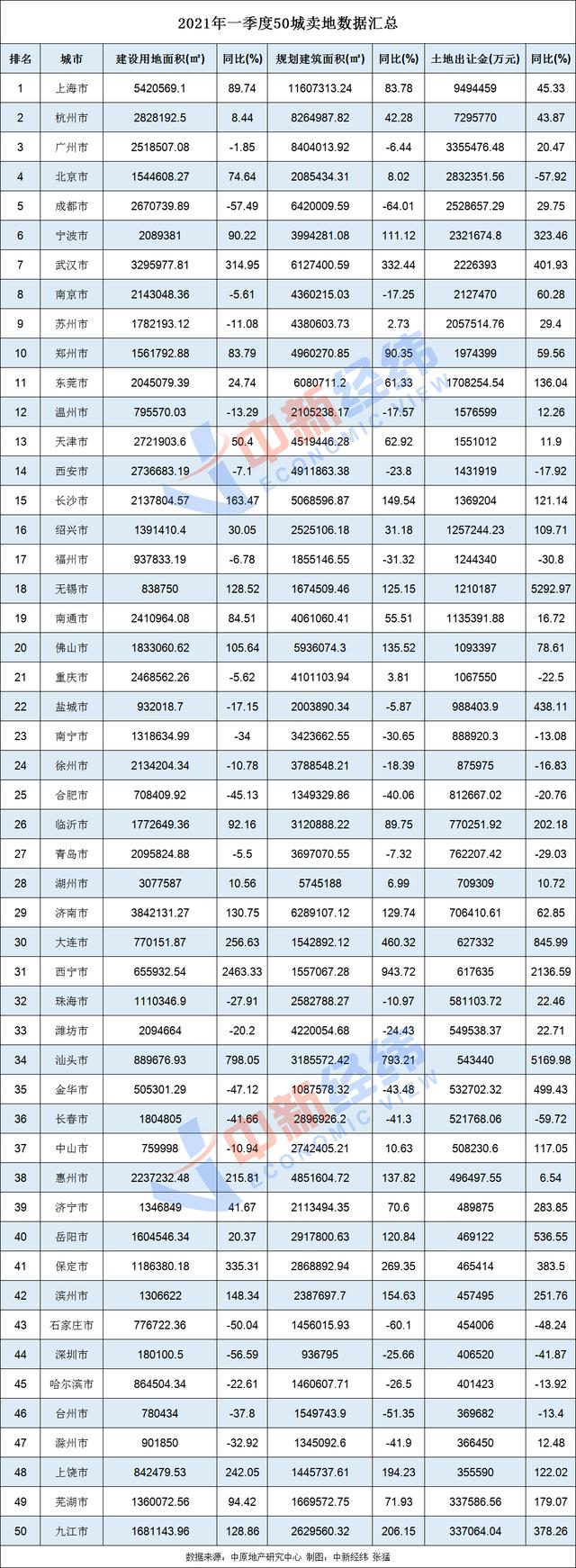 2021年来,房企积极拿地趋势持续。中原地产研究中心统计数据显示,截至3月31日,50城卖地7020.99亿,同比增26%,刷新历史纪录。一季度50城卖地超7000亿具体来看,50城中,一季度,上海卖地超900亿,收入最多;杭州紧随其后,卖地超700亿;广州卖地超300亿,居第三名。在卖地收入增速方面,无锡增速较快,同比增长5292.97%。