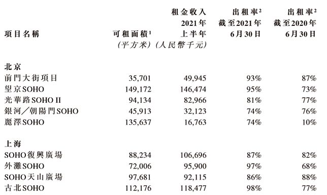截至6月30日,租金收入较高的为望京SOHO,达1.46亿元,出租率95%;上海项目租金收入较高的为古北SOHO,租金收入约为1.18亿元,出租率达98%。