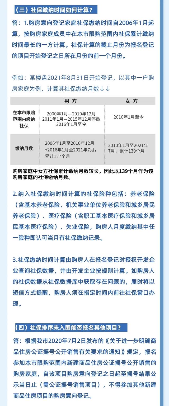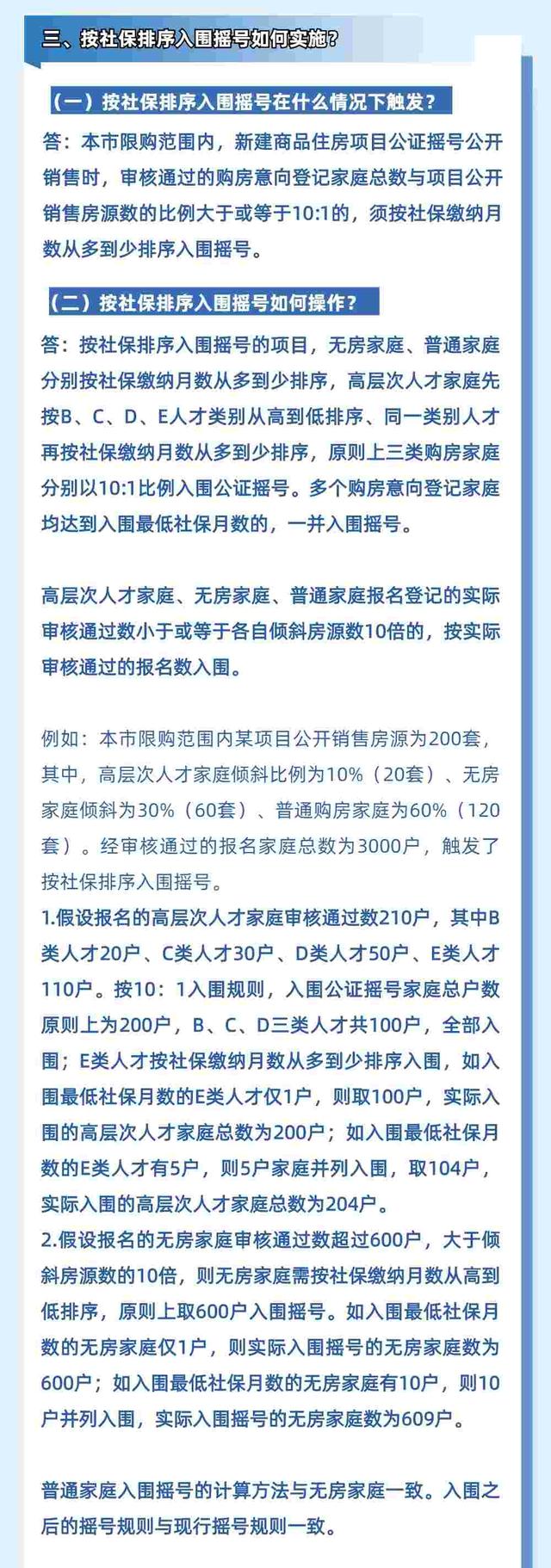 《通知》进一步完善新建商品住房销售管理。一是规定本市限购范围内,新建商品住房项目公证摇号公开销售时,购房意向登记家庭数与公开销售房源数的比例大于或等于10:1的,无房家庭、普通家庭分别按社保缴纳月数从多到少排序,高层次人才家庭先按B、C、D、E人才类别从高到低排序、同一类别人才再按社保缴纳月数从多到少排序,以一定比例入围公证摇号。多个购房意向登记家庭均达到入围较低社保月数的,一并入围摇号。购房意向登记家庭社保缴纳时间自2006年1月起算,按购房家庭成员中在本市限购范围内社保累计缴纳时间最长的一方计算。二是规定本市限购范围内,新建商品住房项目公证摇号公开销售时,购房意向登记家庭数小于或等于公开销售房源数的,开发企业应采取公证摇号方式确定选房顺序并按序售房,剩余房源可自行销售。